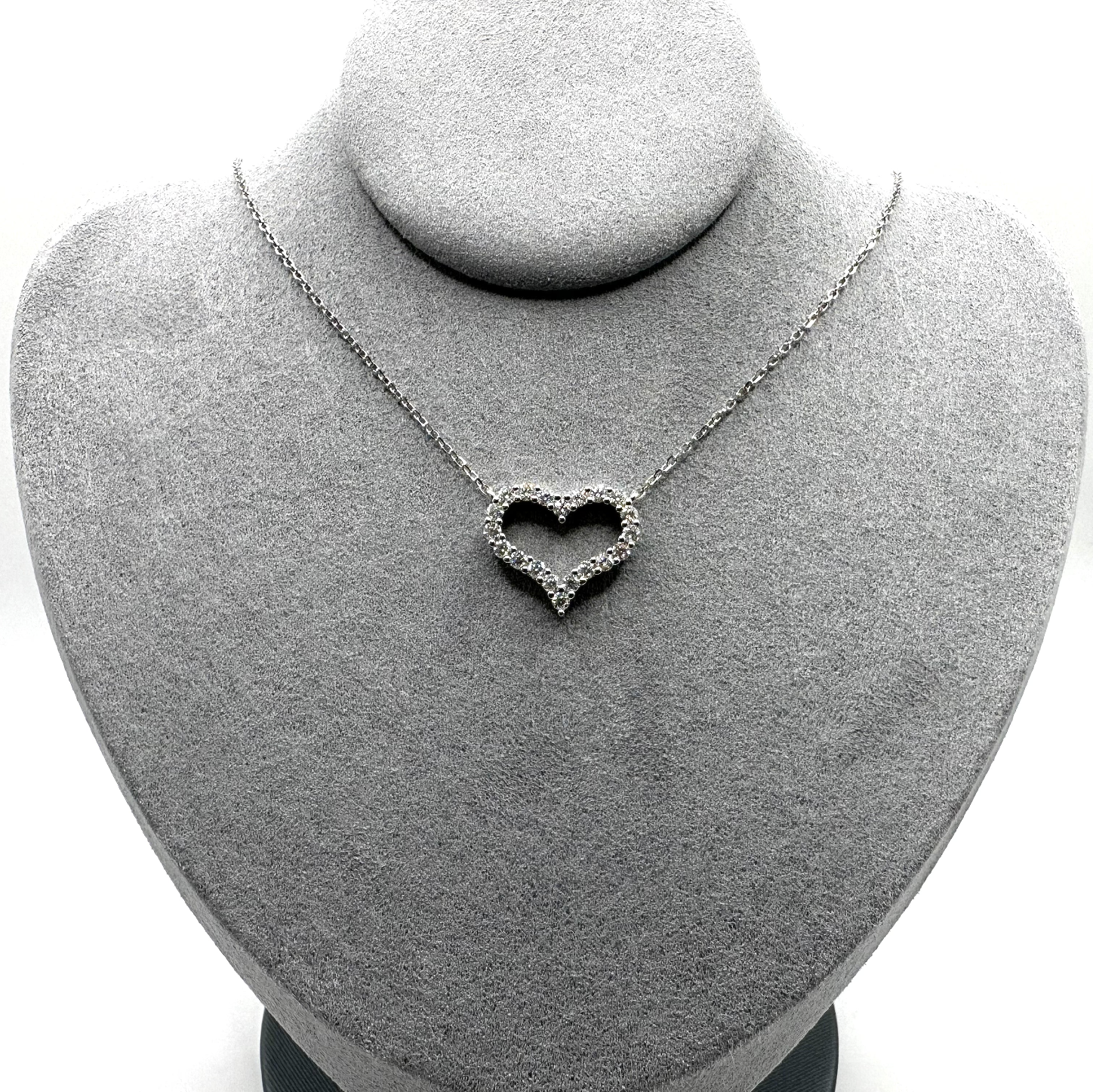 An exquisite symbol of love, this dazzling pendant is designed in a classic heart shape. The open heart frame is adorned with 20 shimmering 0.03ct Moissanite stones in a prong setting. This stunning Moissanite heart pendant is finely crafted in 18K White-Gold plated 925 Silver.