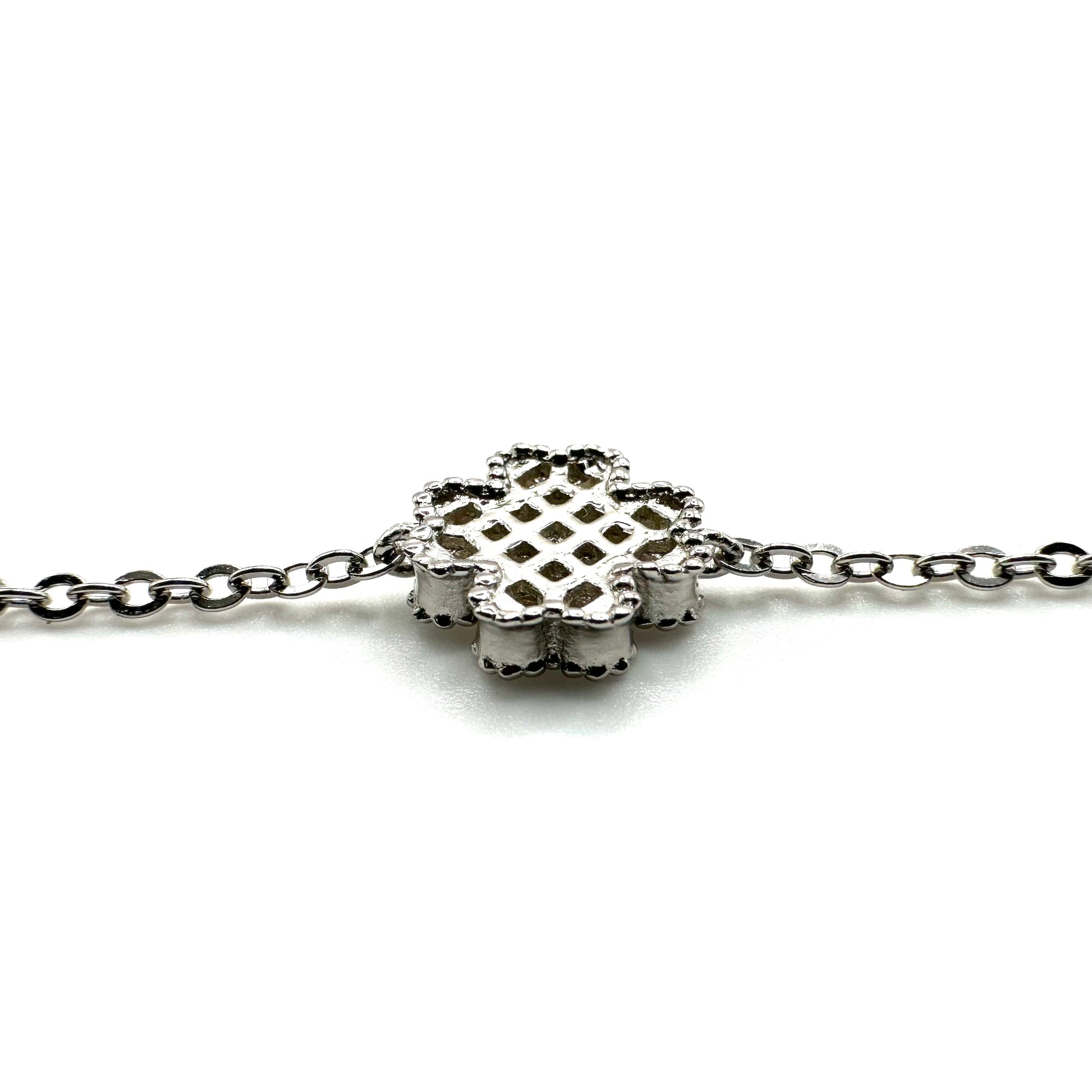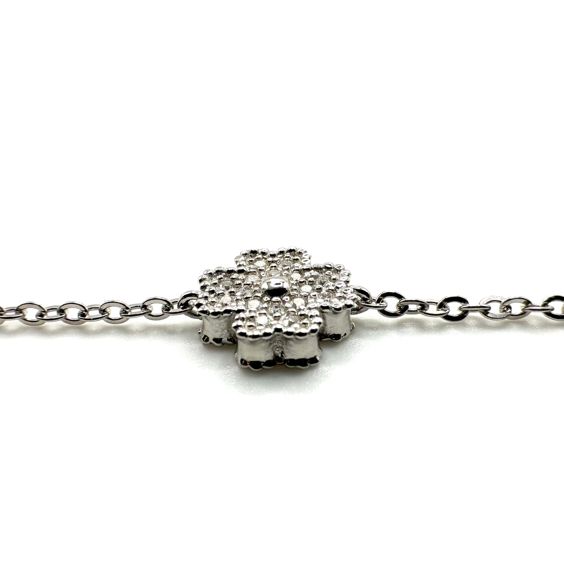 This bracelet features five stunning four-leaf clovers encrusted with sixteen Moissanite stones for a unique, stylish finish. The four-leaf clover represents abundance of love, luck, faith and hope. Enjoy wearing this enchanting, brightly polished bracelet daily.