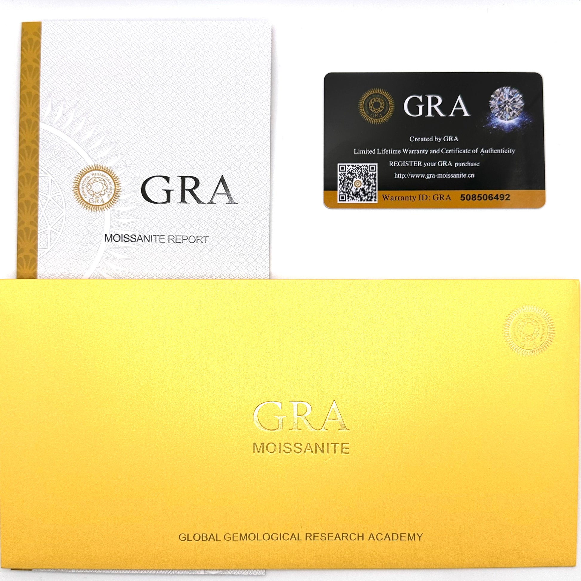 Comes with GRA Moissanite report, microfibre polishing cloth and velvet pouch.